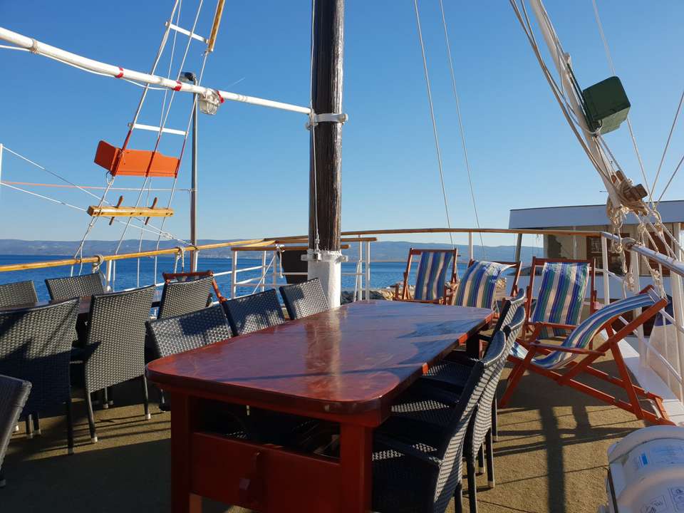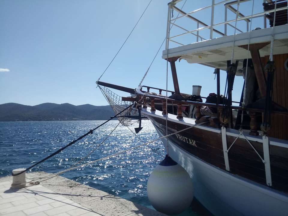 Navigherete a bordo della goletta Vrutak, interamente costruita in legno nel 1940. Con i suoi 23 metri di lunghezza e 5,6 metri di larghezza, questa goletta conta di due ponti. I pasti vi saranno serviti sul ponte superiore. Nel caso in cui il meteo non lo permettesse, potrete invece riunirvi nella sala da pranzo situata sul ponte principale. Durante le traversate potrete rilassarvi sulle sdraio e godervi il magnifico panorama. L’attrezzatura da snorkeling sarà a vostra disposizione per permettervi di esplorare piccole baie immersi nell’acqua turchese.